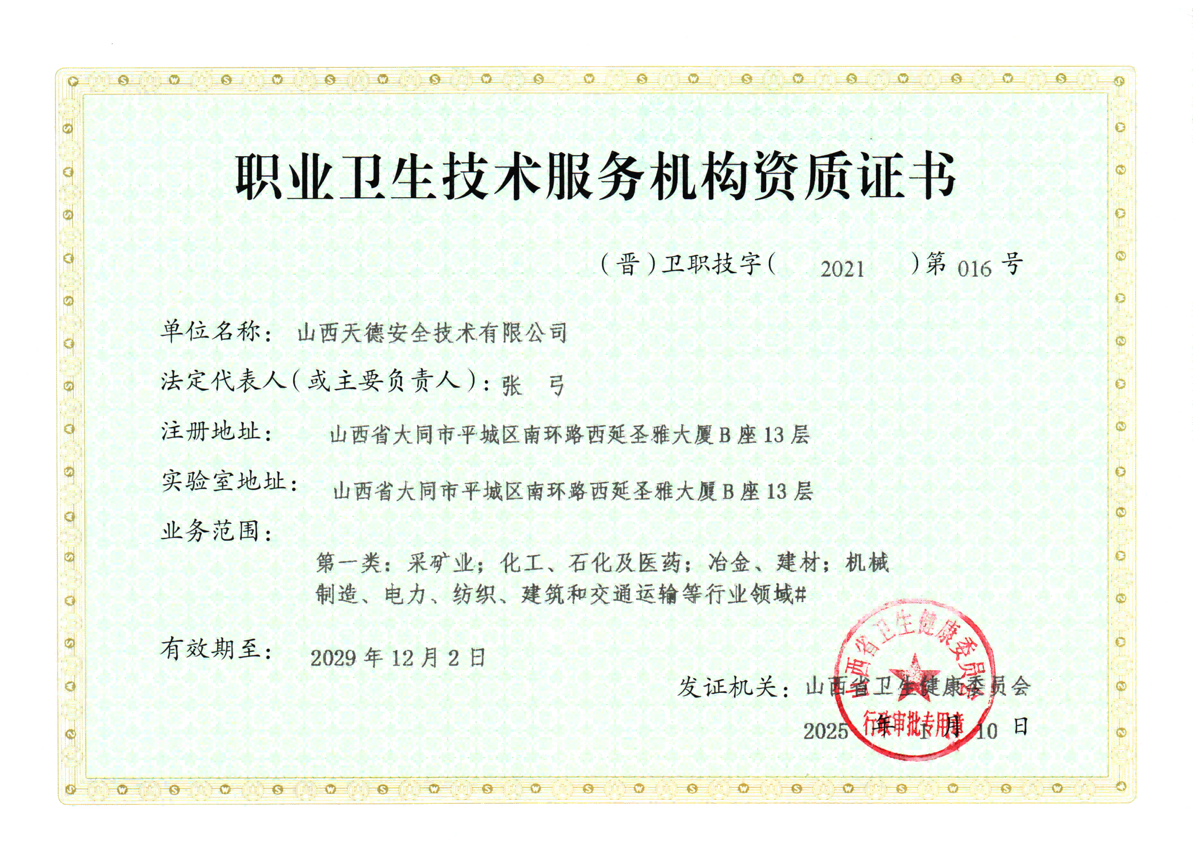 山西天德安全技術有限公司持有山西省衛健委頒發的《職業衛生技術服務機構資質證書》,業務范圍涵蓋:①采礦業、②化工、石化及醫藥、③冶金、建材、④機械制造、電力、紡織、建筑和交通等行業領域。為上述類企業開展職業衛生檢測、評價、技術咨詢和服務。公司辦公場所建筑面積 606m2,其中檢測、檢驗實驗室占地300m2,實驗室功能劃分為理化室、分光光度室、原子熒光室、氣相色譜室、原子吸收室、天平室等,配置有相應的檢驗、檢測設備,配備各類專業技術人員,專業涵蓋預防醫學、公共衛生、衛生工程、采礦工程、冶金、材料學、應用化學、分析化學、通風、機電、自動化、地質、測量等。